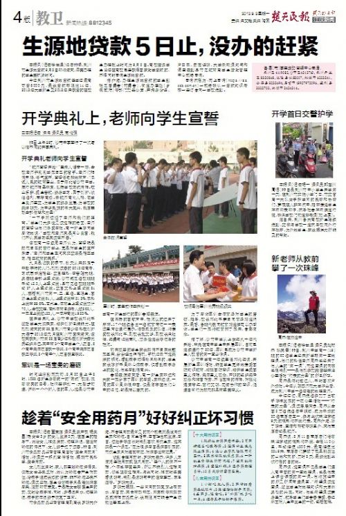 《楚天民報》9月2日4版:開學典禮上 老師向學生宣誓
