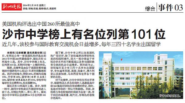 《荊州晚報》2月19日第03版:美國機構評選出中國260所最佳高中 沙市中學榜上有名