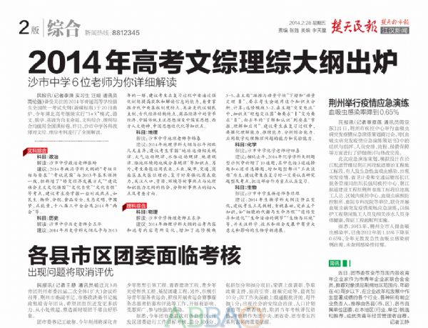 《楚天民報》2月28日第2版:我校教師解讀2014年高考文綜理綜考綱