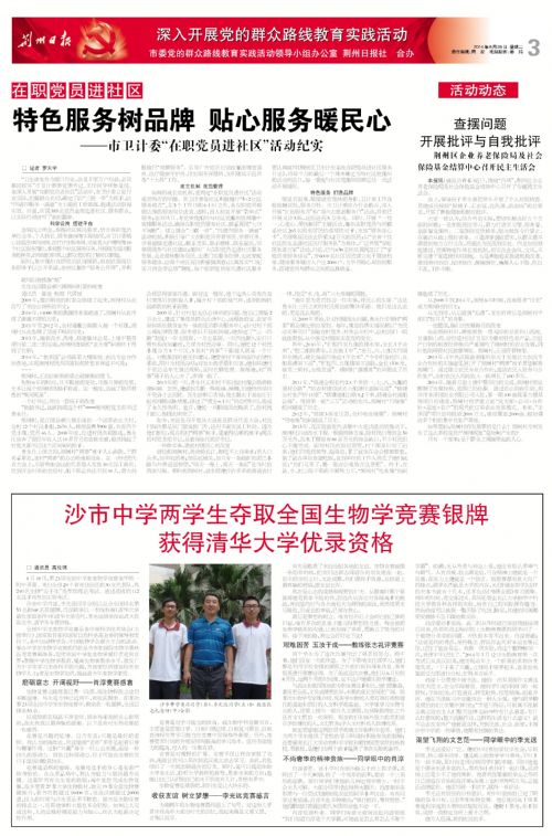 《荊州日報》8月26日報道我校肖淳李光遠獲得生物競賽銀獎
