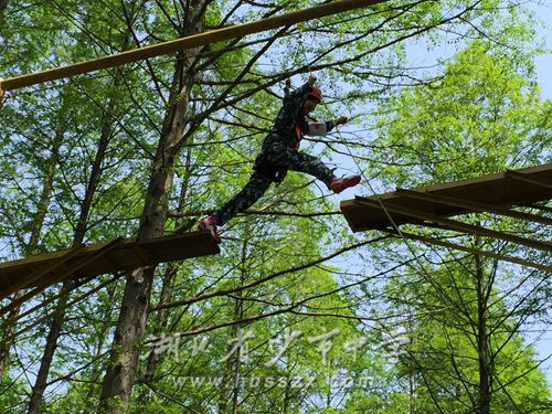 隨后開展的是挑戰自我的高空項目“走斷橋”。要在八米高空跳過寬約一點二米的斷橋對不少人來說真是一個不小的挑戰。但是,當大家在相互鼓勵中勇敢地完成整個挑戰之后,那大大綻放的微笑將內心的喜悅與超越自我的自豪之情表露無遺。