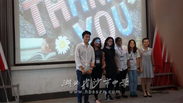 節目表演結束后,來自高二(18)班的瞿詩琦同學用精美的幻燈片和流利的英語介紹了沙市中學的辦學情況,充分展現了沙市中學素質教育的特色和成果;來自新加坡的大學生代表也詳細地介紹了新加坡的教育體系,并利用活動和小品的方式生動地呈現了新加坡課堂教學情境。此外,雙方學生代表還就各自教育狀況進行了交流提問。整個活動互動效果非常好。交流活動結束后,全體代表和志愿者在實驗樓前集體合影。