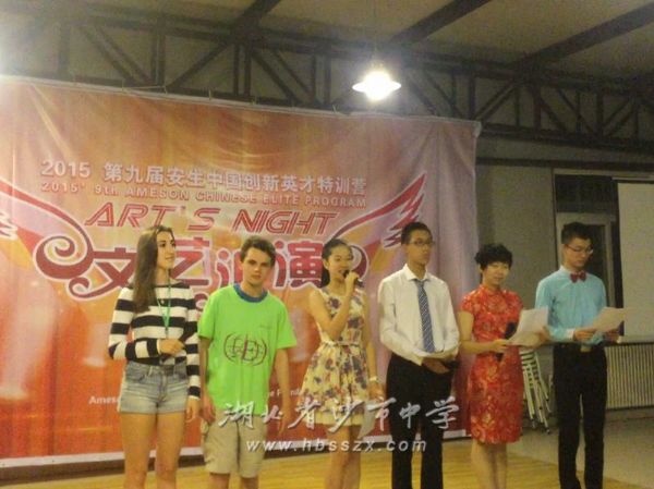 瞿詩琦同學主持的安生英才文藝匯演 經過個人申請,學校推薦,安生文教基金會英才特訓營組委會審核錄取,我校高一年級瞿詩琦、周宇瑞,高二年級劉冰潔、董簡同學參加了在北京舉辦的2015安生中國英才特訓營活動。