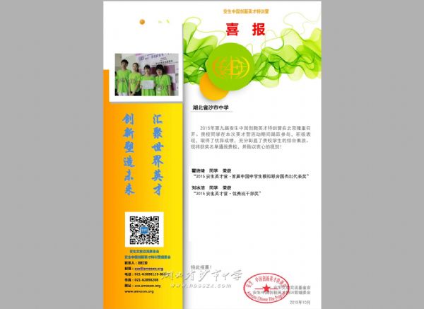 近日,安生文教交流基金會(美國)英才特訓營組委會發來喜報,表彰我校2015暑期參加安生中國英才特訓營的四名學生表現優秀,體現了沙市中學學生的高素質。組委會特別表彰了瞿詩琦(2014級)和劉冰潔(2013級)兩位同學,瞿詩琦同學獲得“2015安生英才營”首屆中國中學生模擬聯合國杰出代表獎;劉冰潔同學獲得“2015安生英才營”優秀班干部獎。