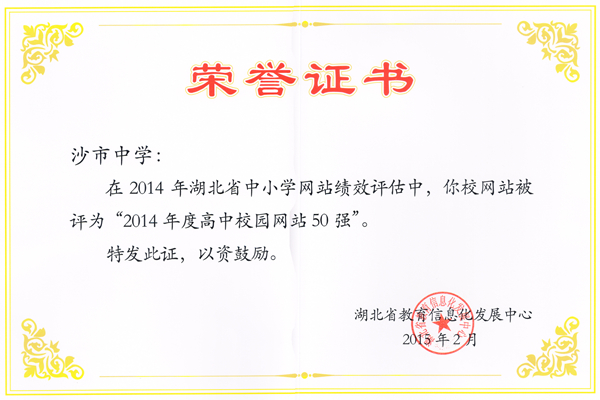 2015年02月學校網站獲評湖北省2014年度高中校園網站50強