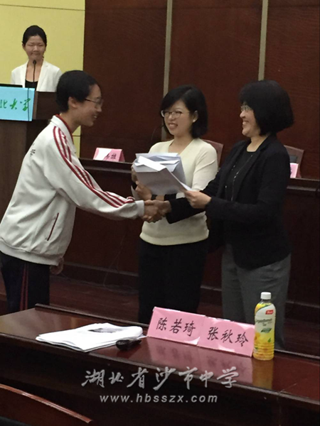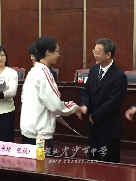 劉畫荻與省教育廳領導交流 5月20日,在湖北大學舉行了“2016高二學生公費留學新加坡項目”最后面試,我校高二(12)班劉畫荻同學表現優秀,順利通過了最后面試關,被錄取,并獲得了全額獎學金。