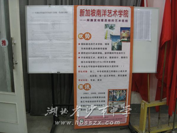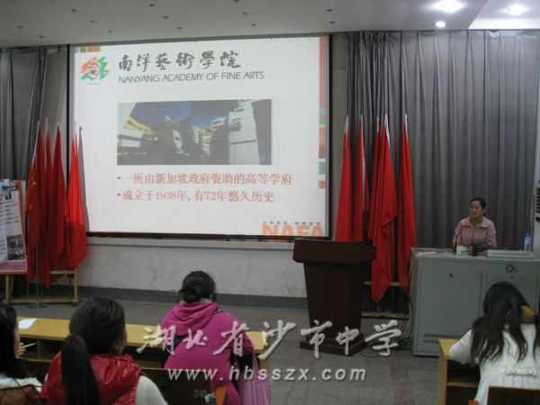11月18日晚8點,新加坡南洋藝術學院(簡稱“南藝”)鄭女士一行三人來到我校,進行了招生宣傳及藝術生招生工作。鄭女士作為“南藝”此次來我校招生的負責人,曾為我校學生。她表示十分感謝母校多年來對她的培養,也希望有更多的沙市中學學生能“邁向世界”進入“選擇新加坡南洋藝術學院”學習。新加坡南洋藝術學院為東南亞頂級的藝術院校。據鄭女士介紹,入讀該校可以享受新加坡政府提供的相當于學費55%的政府津貼(類似我國高校的獎學金)。