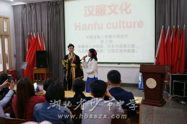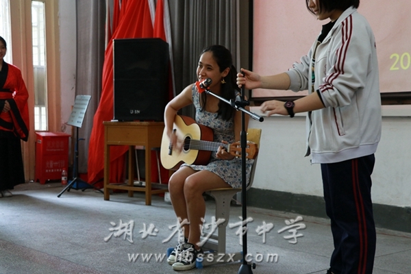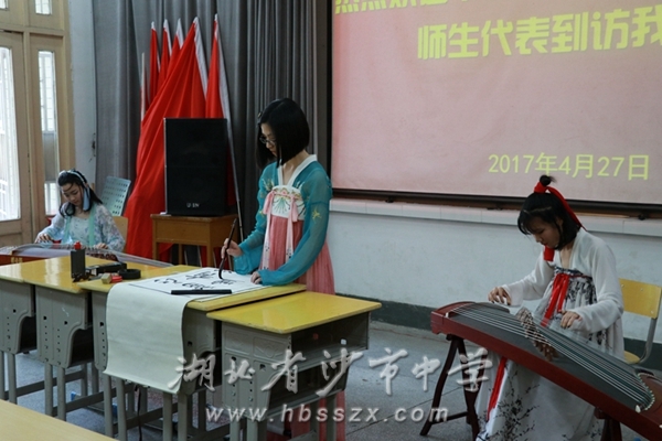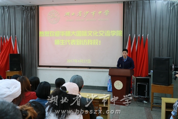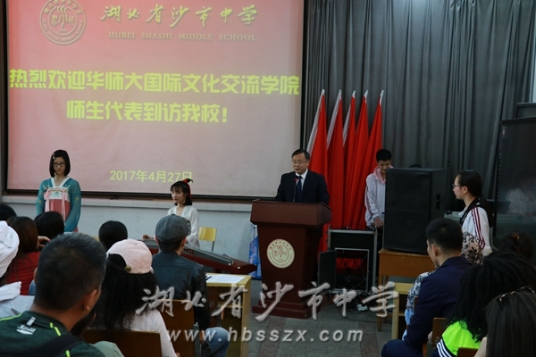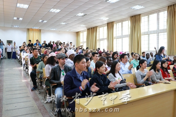 在大階梯教室,訪問團和我校志愿者共同開展了文化交流活動。表演開始前,趙文華副校長致歡迎辭。趙校長介紹了學校的歷史、辦學業績、國際交流與合作活動,以及對留學生來訪給予了高度評價;華師大文化交流學院陸野主任介紹了學院的歷史和辦學業績,并對沙市中學給予了高度評價。