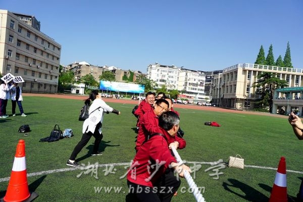 在體育藝術節入場式的最后,我校三個年級的教師身著統一的紅色運動依次進場,引起了學生的陣陣歡呼和尖叫吶喊。隨后, 本著“安全、快樂、比賽”的原則,老師們興致勃勃地參加了由拔河、側頂球、跳長繩接龍以及50米迎面接力四大項目組成的教師趣味運動會。在比賽中,老師時而同心協力,勁往一處使;時而騰空躍進,如翩翩起舞的飛燕;時而團隊協作,同舟共濟……一個個老師洋溢著燦爛的笑容,展現了沙市中學教師們團結拼搏、奮發向上的精神風貌,賽出了風格、賽出了五一節即將到來的幸福感。