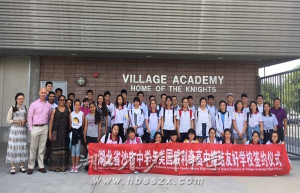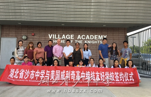 師生代表合影留念(二) 8月的沙市中學新校區洋溢著搬遷的喜慶氣氛,而遠在大洋彼岸的沙市中學2016級43名師生代表見證了百年沙中與美國藍帶高中——威利奇高中(Village Academy High School)建立姊妹學校的重要時刻。這不僅是沙市中學搬遷新校區的一份厚禮,更促進了沙市中學教育國際化發展。