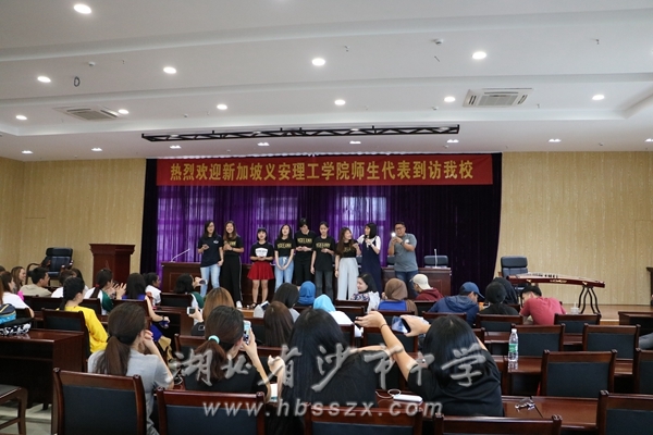 在綜合樓二樓學術報告廳,我校學生代表和新加坡義安理工學院學生代表進行了豐富多彩的文化交流表演、介紹了各自國家的教育制度和教育體系,特別是我校學生的古箏和笛子合奏,義安理工學院學生用活動的方式來介紹新加坡教育體系,贏得了陣陣掌聲。