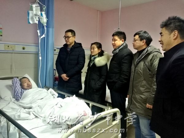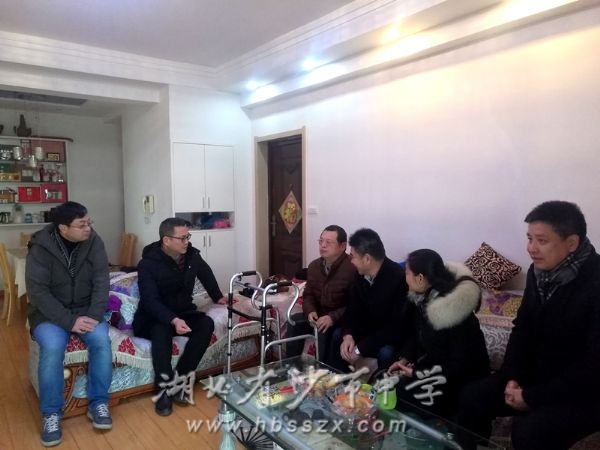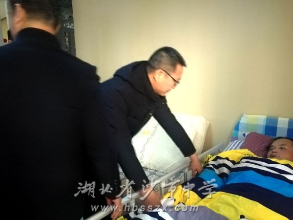 看望劉春雷老師 在新春佳節即將來臨之際,1月27日,學校黨委書記、校長熊禮才同志率領副校長吳本萍、徐善慧及工會主席戴永平、校辦主任黃祥洲、學校工會同志走訪看望生病教職工高俊、李作輝、劉春雷。