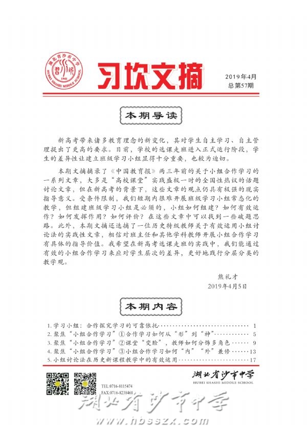 本期文摘摘錄了《中國教育報》兩三年前的關于小組合作學習的一系列文章,大多是“高效課堂”實踐盛極一時的全國性熱議的話題討論文章,但在新高考的背景下,這些文章的觀點仍具有極強的現實指導意義。受條件限制,我們短期內很難開展班級學習小組常態化的教學,但組建班級學習小組是必須的,小組如何組建£如何有效運作£如何發揮作用£如何評價£在這些文章中可以找到一些破題思路。此外,本期文摘還選摘了一位歷史特級教師關于有效運用小組討論法的實踐性文章,相信對班主任和其他學科教師開展小組合作學習有具體的指導價值。我希望在新高考選課走班的實踐中,我們能通過有效的小組合作學習來應對學生層次的差異,更好地踐行分層分類的教學觀。