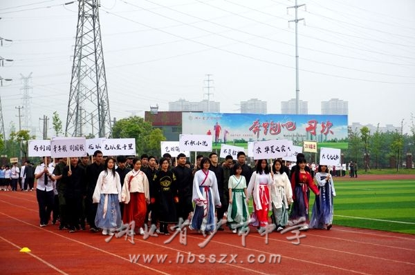 運動會創意入場式從來都是沙市中學經久不衰的話題。伴隨著嘹亮的運動員進行曲,全校35個班級代表隊和4個教工代表隊依次亮相。場面壯觀、氣勢恢弘。自信、快樂、堅毅掛在每個人的臉上。個個精神抖擻、意氣風發。團旗、標語、各式道具在陽光下熠熠生輝,“我們都是追夢人”“我愛你,中國”“美哉,我少年中國,與天不老”的口號聲聲入耳。他們身著精心搭配的服裝,昂首挺胸,踏步前行。或著儒裙,持輕羅小扇;或穿民國學生服,打著愛國、自強等勵志橫幅;或一身國防綠,雄赳赳,氣昂昂,一往無前。古典風、民族風、民國風、歐美風可謂輪番上陣。整齊的步伐,輕盈的舞姿,各具特色的文化創意,無一不體現習坎學子激情昂揚、活力四射的精神面貌與運動態度。