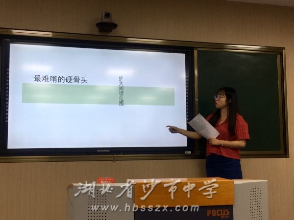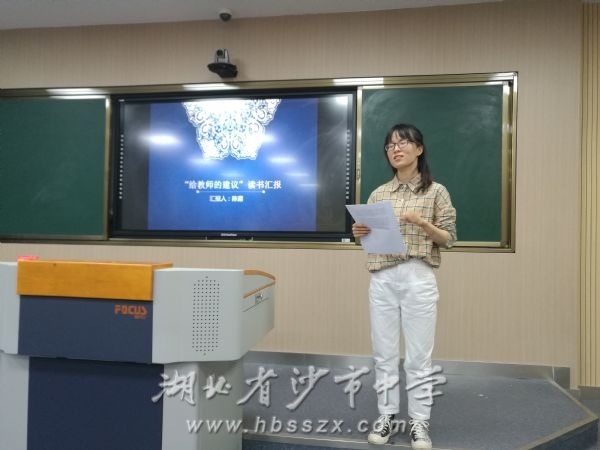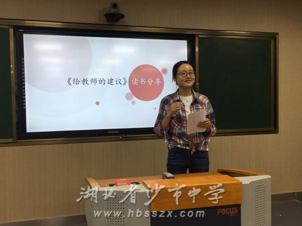 謝佳老師進行分享 第二位分享的是謝佳老師。她結合自己實際教學中的感受和心得體會,說了讀完這本書后的所得所想。她的分享重點是鼓勵學生思考,強調思考和閱讀的重要性。她嘗試著實踐這個觀點,挑選時事熱點,把國外權威雜志的文章刪減和替換為現階段學生的閱讀水平,在緊扣考試題型同時,擴展學生視野,激勵學生積極思考表達觀點。書中可能沒有具體建議,但字里行間表達的對教育的觀念讓人受益匪淺。