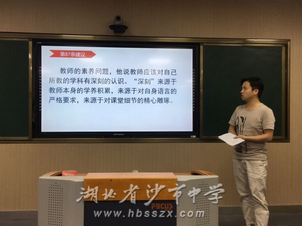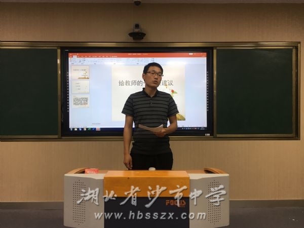 孫旭波老師進行分享 第五位分享的是孫旭波老師,他說要成為一位優秀的體育教師就要有一顆寬容的心、善良的心、要有豐富的科學知識,敏銳的教育眼光,全面的教育技能,崇高的教育理想,始終以此為目標做為對自己的鞭策。閱讀《給教師的一百條建議》一書,書中提出不少的教學建議,每一條建議都是幫助自己解決教學中的實際遇到的問題,其中有的是用實際事例,有的是一些的理論分析,最多的都是蘇霍姆林斯基教育教學中的親身遇到的問題和真實教學案例,書中其中一條《怎樣使學生注意力集中》,知道了控制注意力的問題,它是教師工作中最精細而且研究還不充分的領域之一,要能控制注意力,可以做到兩點:一是,要懂得高中生的心理,了解他的年齡特點。二是,注意力持久的關鍵是學生上課會思考,并能體驗體育活動中成功的快樂,即學生一邊能積極地思考,一邊能大膽模仿動作,積極練習,教師及時的給與鼓勵贊賞和展示,把不隨意注意與隨意注意結合起來,學生的注意力才能保持高度集中,才不會感到疲憊不堪。