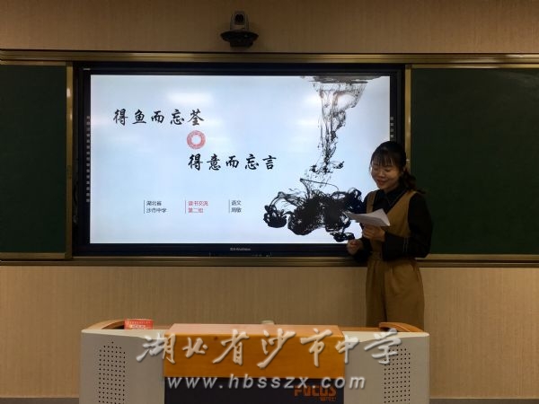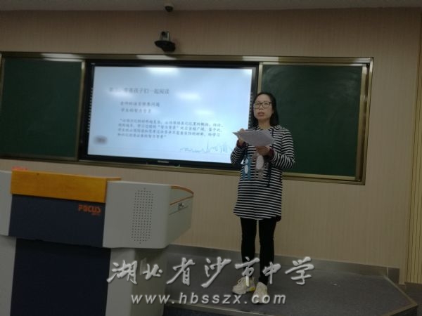周敏老師進行分享 第四位分享自己的讀書心得的是周敏老師。周老師的交流主題是“得魚而忘荃,得意而忘言”,她結合蘇霍姆林斯基在《給教師的建議》這本書中闡述的兩類教師的上課狀態,發表了自己的見解,她認為當一門技能被反復地操練乃至進一步內化后,那些僵硬的外在模式則成了一種負累。教師應當在吃透教材、吃透自己的教學設計、對知識性的東西有了深刻了解之后,淡化所有設計,上課時,教師要專注于學生的腦力活動,而不是教材教案設計,思維要靈敏靈活,不能拘泥于定式,這樣才能生成一節鮮活的語文課。