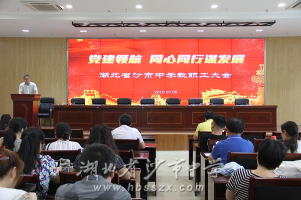 全體教職工大會會場 7月5日下午4時,沙市中學220余名教職員工齊聚綜合樓二樓會議室,召開2019年春季學期最后一次全校教職工大會。大會的召開,也標志著2018-2019學年的勝利結束。