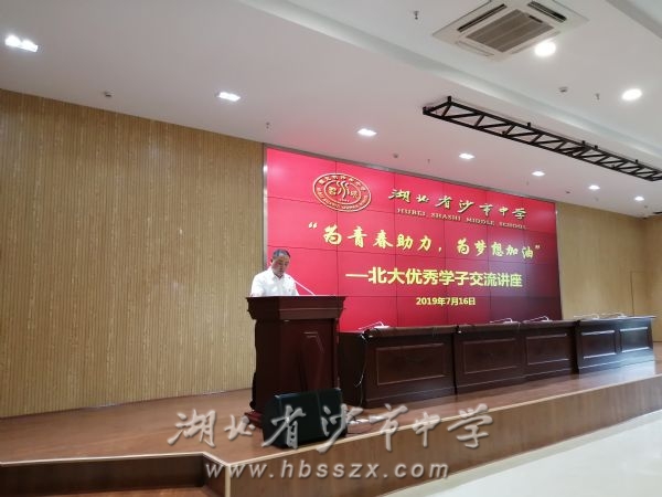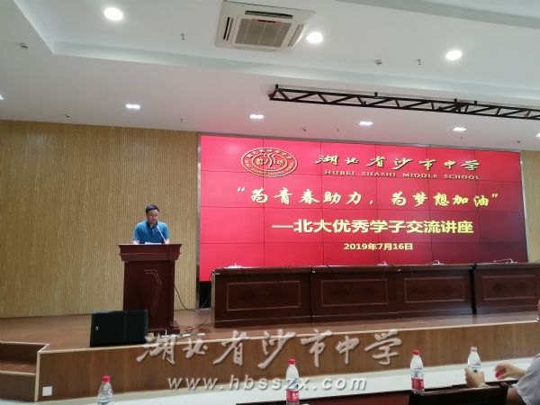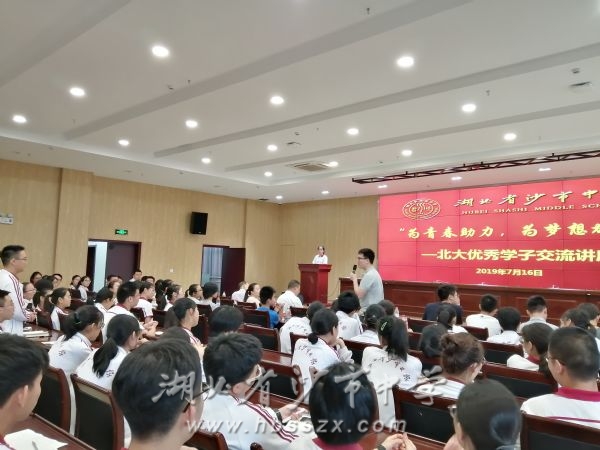 7月16日下午,我校高三年級在學(xué)校綜合樓二樓報告廳成功舉辦了題為“為青春助力,為夢想加油”的北大優(yōu)秀學(xué)子交流講座活動。本次活動在中共荊州市委組織部人才辦的協(xié)調(diào)領(lǐng)導(dǎo)下、荊州市教育局的支持下,邀請到了在荊州參加暑期社會實(shí)踐的北京大學(xué)光華管理學(xué)院的六位優(yōu)秀學(xué)生代表來我校與高三年級重點(diǎn)班的學(xué)生進(jìn)行面對面的交流。參加本次活動的領(lǐng)導(dǎo)和同學(xué)有荊州市委組織部人才科科長熊濤、荊州市委組織部人才科副科長王樂勤、湖北省沙市中學(xué)黨委委員、副校長徐善慧,北京大學(xué)光華管理學(xué)院優(yōu)秀學(xué)生代表付啟航、周子焜、儲云飛、洪揚(yáng)、龔晟源、王宇軒以及我校高三重點(diǎn)班師生200余人。
