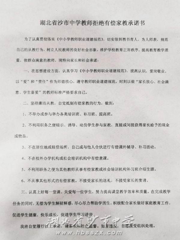 《湖北省沙市中學教師拒絕有償家教承諾書》 8月26日上午,沙市中學在綜合樓二樓會議室召開了2019-2020新學年第一次教職工大會。為了積極響應荊州市教育局號召,進一步加強師德師風建設,規范教師從教行為,借此次新學期教職工大會的契機,黨委書記、校長熊禮才同志進行了有償家教治理工作的部署。
