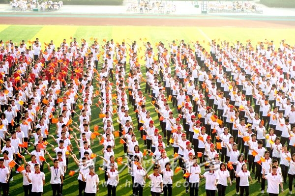 本次運動會一改以往以班級方陣入場的方式,采用了隊形組字和合唱紅歌的形式,既有創新,又進行了愛國主義教育。