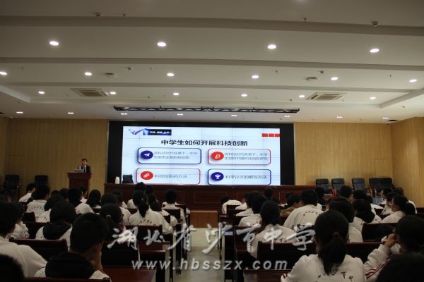 省青少年科技中心還為我校學生帶來了精彩的科技講座,省知名中學生科技創新教師劉斌在習坎論壇中做了主題為 “高科技時代背景下的中學生科技創新”的講座,在論壇正式開始前,靖春元主任一行在學校領導的陪同下來到會場與學生見面,并發表了精彩講話,我校學生表示了熱烈的歡迎。教導處主任肖述友主持了講座,高一年級近300名學生參加了論壇。