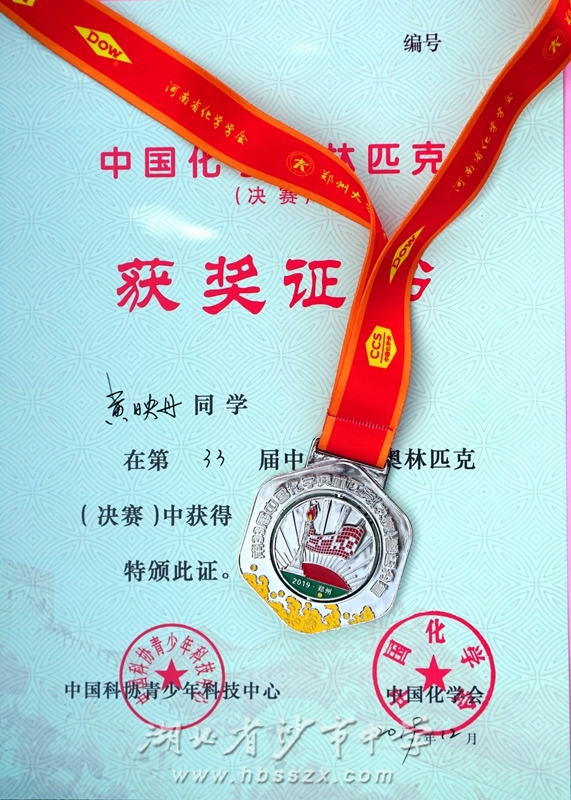 黃映舟同學(xué)的獲獎證書和獎牌 12月4日,第33屆中國化學(xué)奧林匹克(決賽)暨冬令營在河南鄭州落下帷幕,沙市中學(xué)1702班黃映舟同學(xué)發(fā)揮出色,獲得銀牌。
