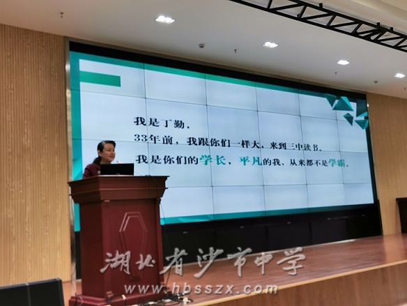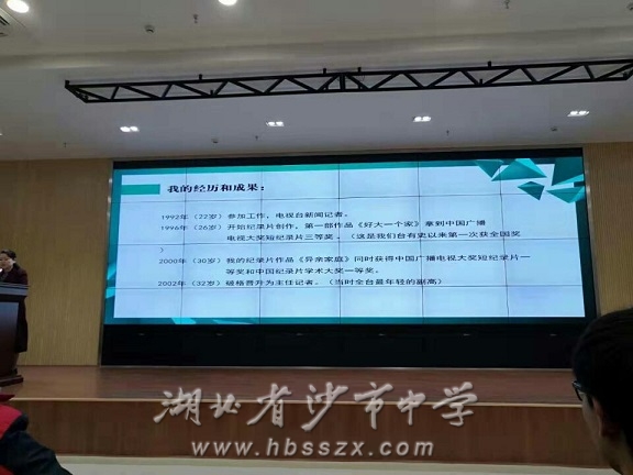 丁勤校友的講座內(nèi)容分為四個部分:一是“我是誰”;二是“為了誰”;三是“終生學(xué)習(xí)”;四是“成長快樂”。她首先滿懷深情地回顧了沙市中學(xué)高中時代的生活,感恩母校和老師的培養(yǎng),感恩同學(xué)的陪伴。其次,她談到學(xué)生時代選擇媒體專業(yè)是希望將來閱人無數(shù),可以看到優(yōu)秀的人、有趣的事,強調(diào)興趣是最好的老師,事業(yè)的起點是來自于內(nèi)心的熱愛。她從早期作品的獲獎經(jīng)歷入手,向同學(xué)們剖析事業(yè)成功之路的根源,不僅需要濃厚的興趣,更需要拼搏、敬業(yè)和創(chuàng)新,需要迎難而上,堅韌不拔。