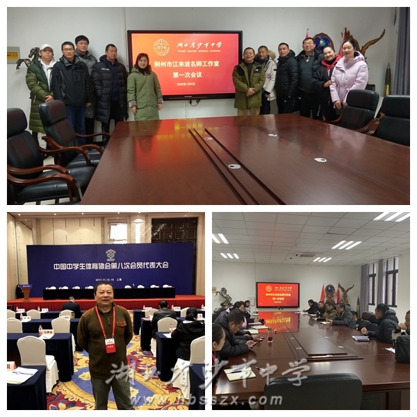 上圖為荊州市江來波名師工作室全家福;下左圖為江來波老師參加全國會議;下右圖為江來波名師工作室召開首次成員工作會
