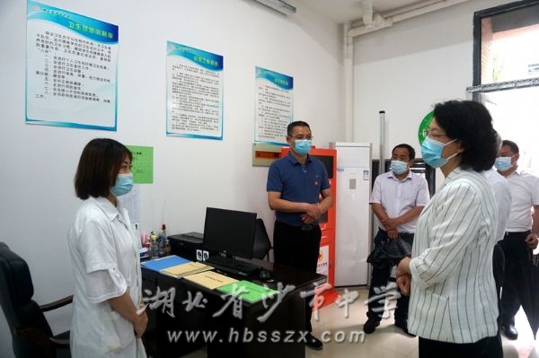 在學校醫務室,肖副省長向駐校校醫詢問高三復學以來的學生體溫記錄和校醫的編制、職稱問題。