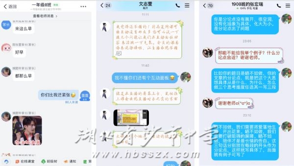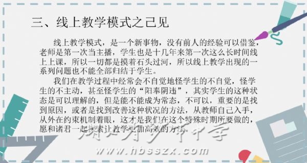 時舜老師作為年級第一個上直播課的數學老師,對線上教學的利弊分析很是深刻,他認為,線上教學之弊,在于師生互動形式單一甚至缺失,教師監管弱化,小組討論展開困難,其利在于作業反饋及時,能設計突破課時的“大小課”和突破時間限制的“長短課”,能對學生進行個性化的教學輔導。他提出,要做好線上教學,教師一方面要準備好直播設備,掌握好各種技術,另一方面更要提高自身專業水平,只有這樣,才能真正留住學生,不讓學生“掉線”。
