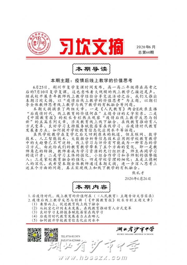 6月25日,荊州市復學復課時間發布,高一高二年級將在高考之后的7月10日復學復課,這也意味著大規模的線上教學已接近尾聲。繼我校開展青年教師線上教學經驗分享交流活動之后,我們又推出本期習坎文摘,以“疫情后線上教學的價值思考”為主題,以期引導全體教師思考線上教學與線下教學的有機融合等問題。