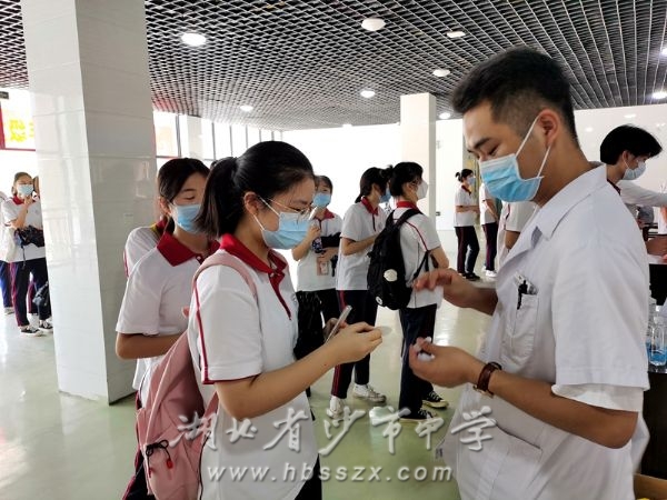 荊州第一人民醫院非常重視這次為沙市中學高一高二學生安全復學的檢測工作,醫院選派了業務精湛、技術嫻熟的醫護人員來到學校。他們或為同學們舒緩緊張情緒,或為同學們講解怎樣粘貼專屬檢測條形碼。