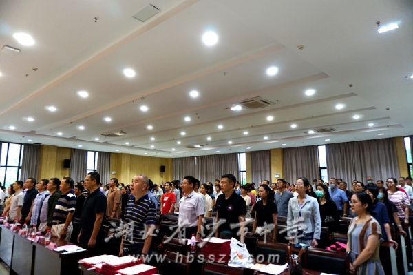 全體老師高聲齊唱中華人民共和國國歌,老師們充滿激情的歌聲響徹會場。