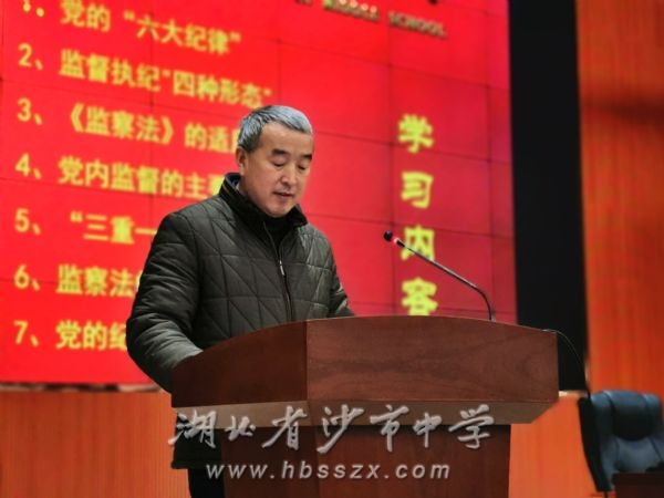 張志禮同志提要求 推進黨章黨規黨紀和國家監察法規宣傳教育“十進十建”工作是一體推進不敢腐不能腐不想腐的重要載體,是省紀委監委部署的一項長期性宣傳教育工作。為認真貫徹落實省紀委監委工作要求和市紀委五屆五次全會工作部署,11月27日,湖北省沙市中學在藝術報告廳召開了推進黨章黨規黨紀和監察法規宣傳教育進校園現場會。