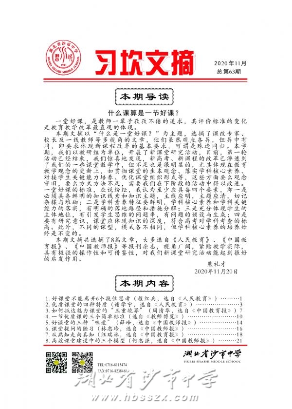 《習坎文摘》第63期:什么課算是一節(jié)好課? 為推進活動順利開展,促成教師教學觀念的更新,學校教科處以“什么課算是一節(jié)好課?”為主題,印發(fā)了了《習坎文摘》(第63期),該期文摘選編了《人民教育》、《中國教育報》、《中國教師報》等報刊雜志的8篇文章,視角廣闊,緊貼教學實際,具有極強的操作性和可借鑒性,對我們新課堂研究活動能起到很好的啟發(fā)作用。
