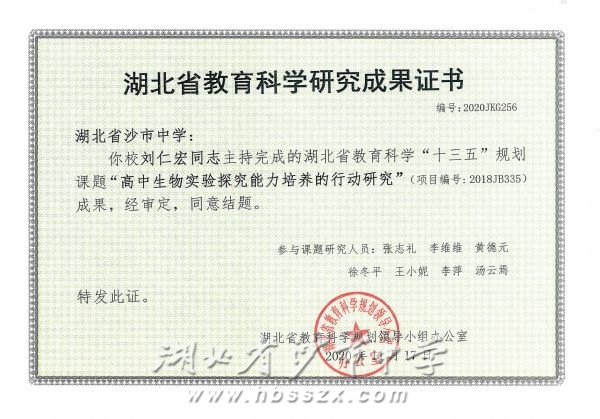 該課題的研究成果,得到了湖北省教育科學規劃領導小組評審專家的認可,專家們認為該課題選題切合教育教學實際,體現了較為鮮明的校本特色。課題組的研究態度嚴謹,研究過程扎實,課題管理規范,活動開展有序。課題研究成果豐富,具有一定的創新性,其構建的“培養學生生物實驗探究能力的行動方案”具有較強的可操作性和示范性。