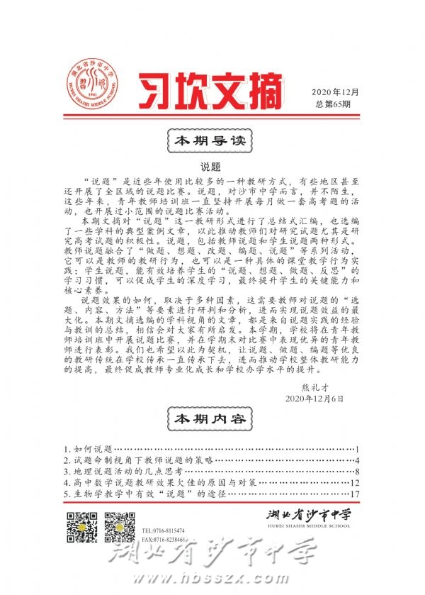 說題效果的如何,取決于多種因素,這需要教師對說題的“選題、內容、方法”等要素進行研判和分析,進而實現說題效益的最大化。本期文摘選編的學科視角的文章,都是來自說題實踐的經驗與教訓的總結,相信會對大家有所啟發。本學期,學校將在青年教師培訓班中開展說題比賽,并在學期末對比賽中表現優異的青年教師進行表彰。我們也希望以此為契機,讓說題、做題、編題等優良的教研傳統在學校傳承一直傳承下去,進而推動學校整體教研能力的提高,最終促成教師專業化成長和學校辦學水平的提升。