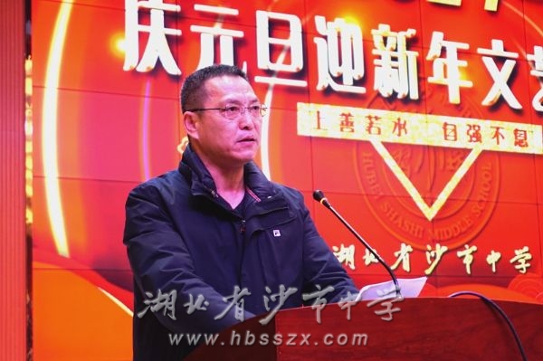 在習坎漫溯樂隊勁爆似火的《逍遙行》開場曲之后,學校黨委書記、校長熊禮才上臺致辭。他援引世界知名媒體對令人五味雜陳的2020年的評價,認為相對于世人的“糟糕、驚心”,作為中國人是既艱難又溫暖。當病毒如迷霧仍在世界各地肆虐,當巨量增長的感染人數仍呈幾何式上升,我們是何其慶幸自己生活在安定的中國。他啟發同學們要珍惜和守護這份來之不易的安定。他分析了2021年的國家形勢和沙市中學重要任務,明確了2021年學校工作思路,希望同學們勇敢踐行學校年度漢字“拼”的精神。他說:“沒有哪一個黎明能阻止陽光,越是艱難,越要有狹路相逢勇者勝的敢拼敢闖的精氣神。……實現偉大夢想的道路一定不會是鋪滿鮮花的舒適之旅,需要我們劈山開路、刳木為舟,拼搏而行。”