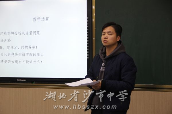 數學組青年教師時舜說題 在說題過程中,參賽教師圍繞事先選定的一道高考真題,從命題立意、試題分析、解題過程、規律總結、變式拓展和備考啟示等環節展開。15位老師精彩紛呈的解說,充分展現了習坎人特有的風采。