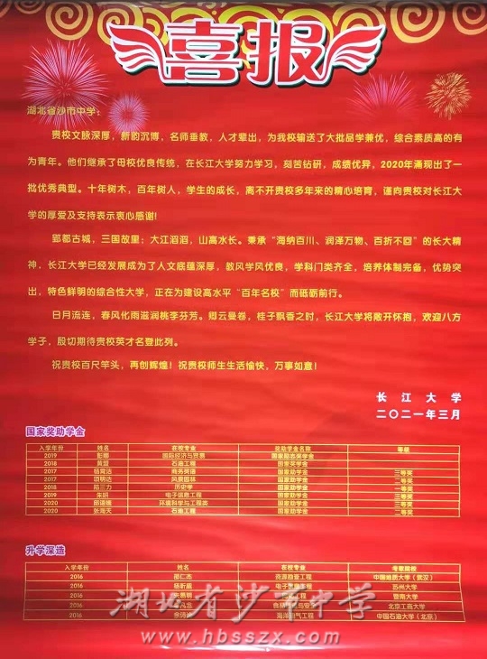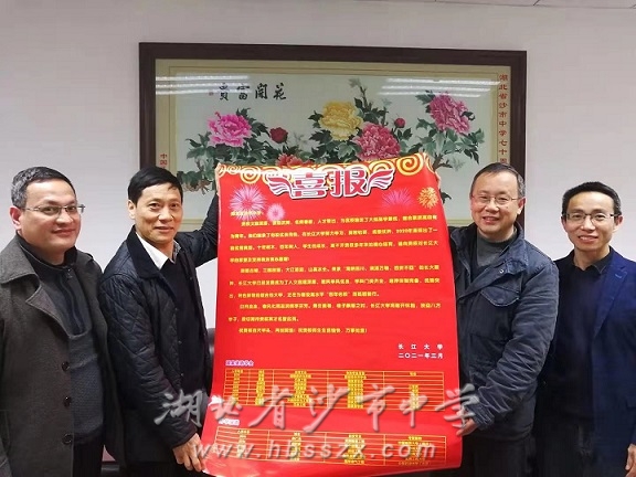 3月19日下午,長江大學信息與數學學院高迎斌書記、袁海山副書記一行親臨我校,為我校送來喜報,祝賀我秀優秀畢業生朱妍等八位學生榮獲國家獎助學金,祝賀邵仁杰等五位學生考取蘇州大學等重點高校研究生繼續升造學習。
