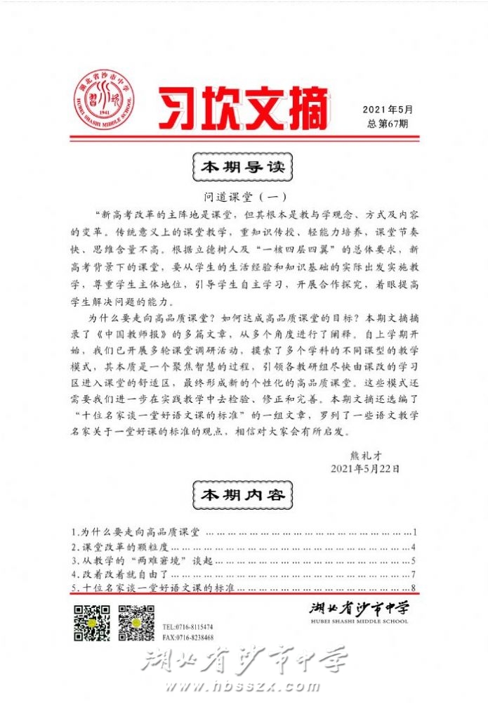 為什么要走向高品質課堂?如何達成高品質課堂的目標?本期文摘摘錄了《中國教師報》的多篇文章,從多個角度進行了闡釋。自上學期開始,我們已開展多輪課堂調研活動,摸索了多個學科的不同課型的教學模式,其本質是一個聚焦智慧的過程,引領各教研組盡快由課改的學習區進入課堂的舒適區,最終形成新的個性化的高品質課堂。這些模式還需要我們進一步在實踐教學中去檢驗、修正和完善。本期文摘還選編了“十位名家談一堂好語文課的標準”的一組文章,羅列了一些語文教學名家關于一堂好課的標準的觀點,相信對大家會有所啟發。