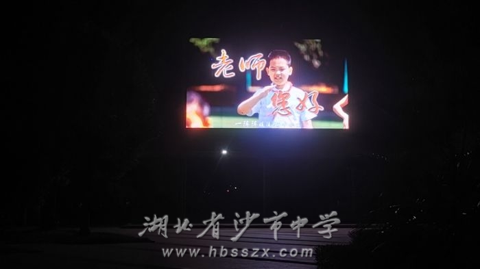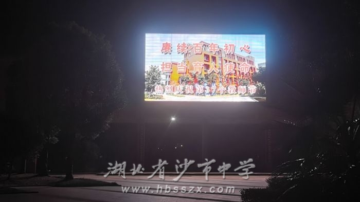 學校大屏幕 9月9日晚8點,沙市中學門前的 LED 文字屏及學校內的大型 LED 全彩屏上,悄然顯示出“賡續百年初心,擔當育人使命”"老師,您好!"“教師節快樂!”的圖文畫面,這標志著沙市中學為迎接第37個教師節而開展的"為教師亮燈"公益活動正式啟動。