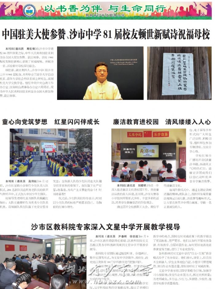 《荊周刊》2021年10月18日報道我校81屆校友、中國駐美大使館參贊頓世新賦詩祝福母校建校80周年