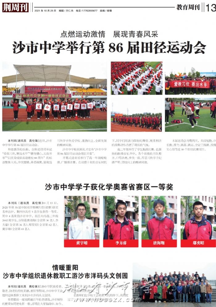 《荊周刊》2021年10月25日?qǐng)?bào)道我校舉辦田徑運(yùn)動(dòng)會(huì)、化學(xué)奧賽獲獎(jiǎng)、老教師活動(dòng)等三事