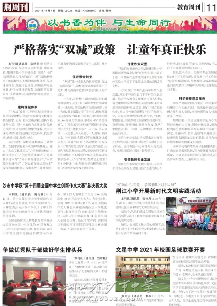 《荊周刊》2021年11月1日報道我校獲"第十四屆全國中學生創新作文大賽"總決賽大獎