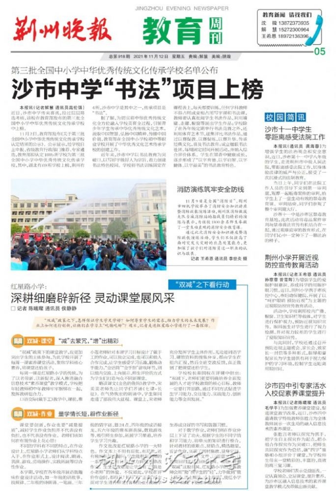 《荊州晚報》2021年11月12日報道我校入選第三批全國中小學中華優秀傳統文化傳承學校名單