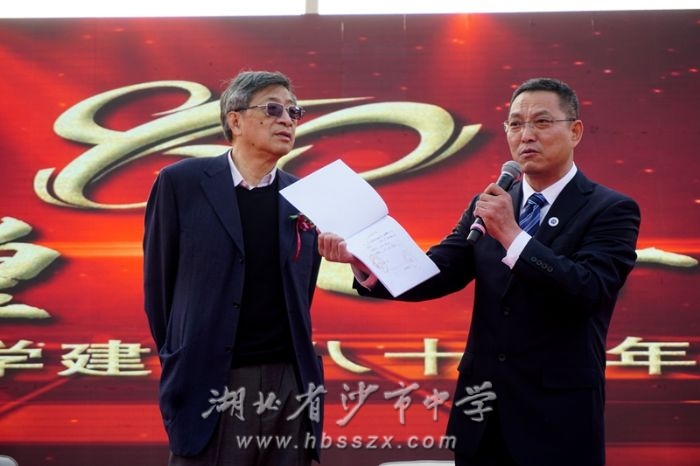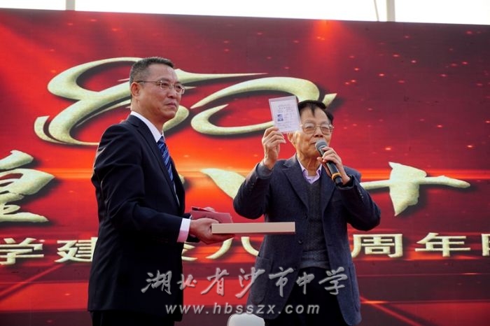 兩位院士的開場白之后,熊禮才校長向兩位院士贈送了有著特別意義的禮品。據介紹,贈給樊明武院士的禮品是他在沙市中學就學時的成績檔案、操行評語等;贈給陳和生院士的禮品是他在沙市中學和同事們在一起工作的照片、個人填寫的工作記錄表等。兩位院士也回贈了沙市中學禮品。樊院士將自己的院士證原件、中央黨校畢業證、出席全國黨代會、人代會的參會證等贈送給了學校;陳院士將自己珍藏的北京正負電子對撞機建成紀念盤送給學校,并介紹了紀念盤上由著名畫家李可染先生創作的陰陽圖的深刻內涵。