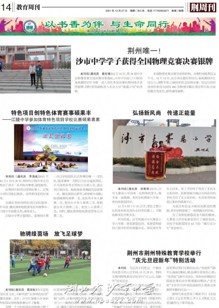 《荊周刊》2021年12月27日報道我校獲得荊州唯一全國物理競賽決賽銀牌
