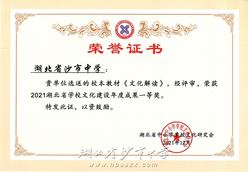 12月24日至26日,第十三屆湖北學校文化論壇與“第三次會員代表大會”在武漢舉行。在大會進行的學校文化評比中,沙市中學被授予“2021湖北省學校文化建設百強校”榮譽稱號,唐年新、秦卓瓊老師被評為2021湖北省學校文化建設先進工作者,校本教材《文化解讀》被評為2021湖北省學校文化建設年度成果一等獎,唐年新、張丹合著的《如何在中學生中開展黨史教育》榮2021湖北學校文化建設優秀論文獎。